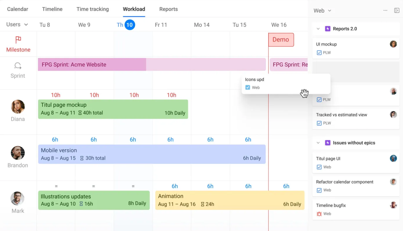 - Team capacity management: an automated workload view that highlights team availability and prevents burnout by spotting bottlenecks early.