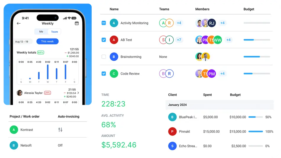 - Time tracking with optional activity and productivity metrics.