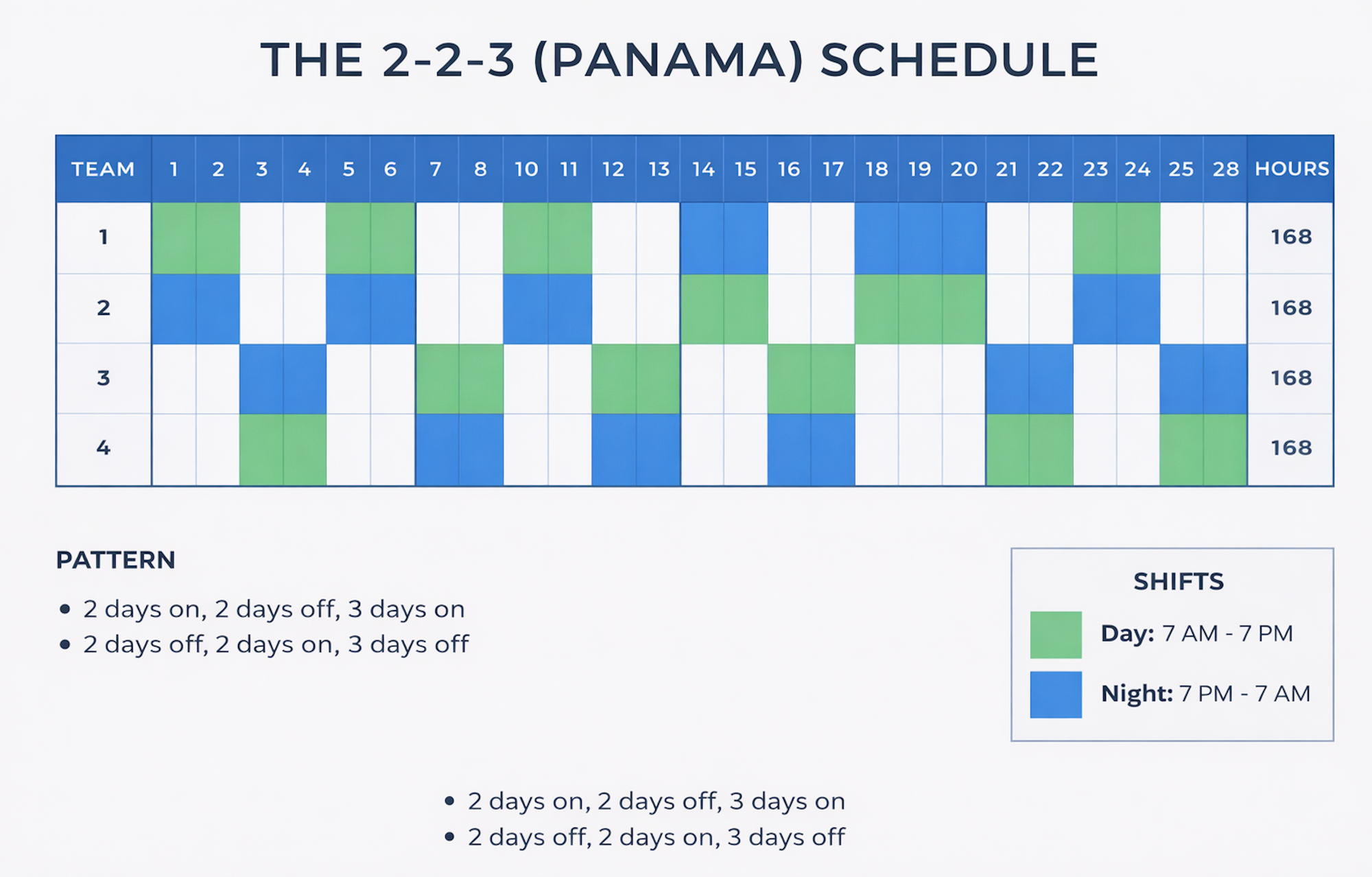 The schedule is commonly known as the Panama schedule and is widely used in industries that require uninterrupted operations, such as healthcare, manufacturing, energy, and emergency services. The structure distributes shifts across several teams so businesses can operate 24/7 while employees still receive regular recovery days.