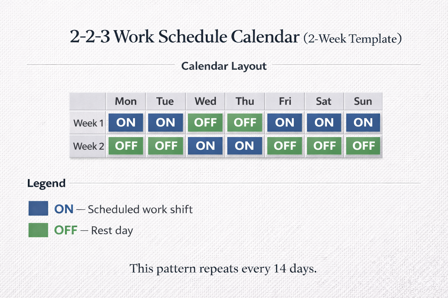 The 2-2-3 schedule meaning refers to a rotating shift pattern where employees work two days, take two days off, then work three days before the pattern reverses the following week. This 2 on 2 off 3 on 3 off schedule creates a repeating two-week cycle that helps organizations maintain continuous staffing.