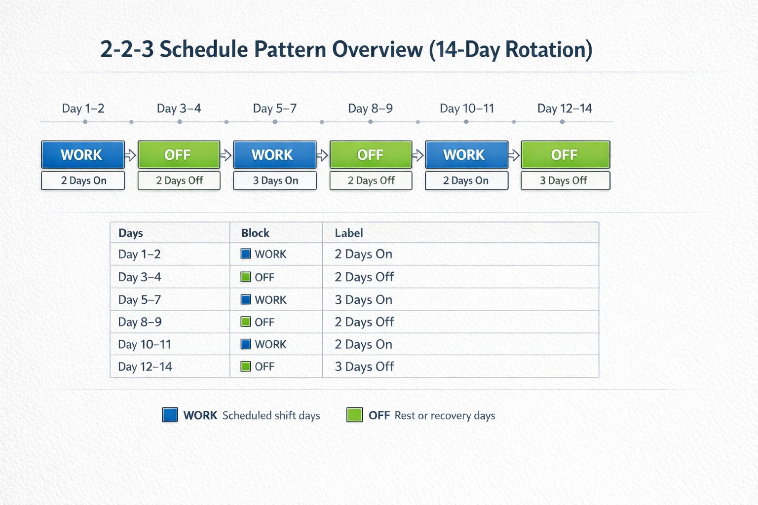 A 2-2-3 schedule is a rotating shift pattern where employees work two days, take two days off, then work three days before the pattern reverses the following week. The cycle repeats every 14 days, allowing organizations to maintain continuous staffing without relying on a traditional five-day workweek.