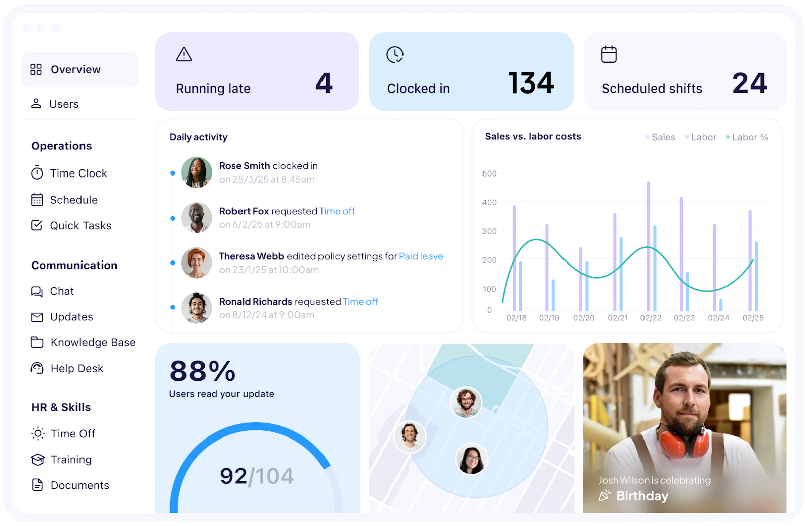 For frontline managers, this simplifies daily coordination. Shifts, hours, tasks, and team updates live in one place, reducing reliance on texts, emails, and spreadsheets. The result is clearer oversight without building a full HR stack.