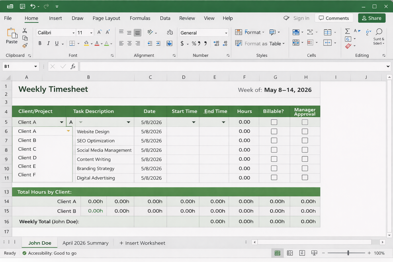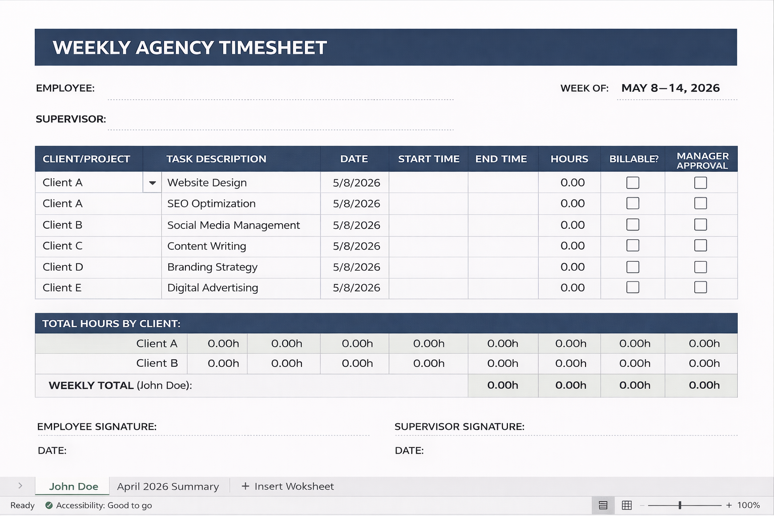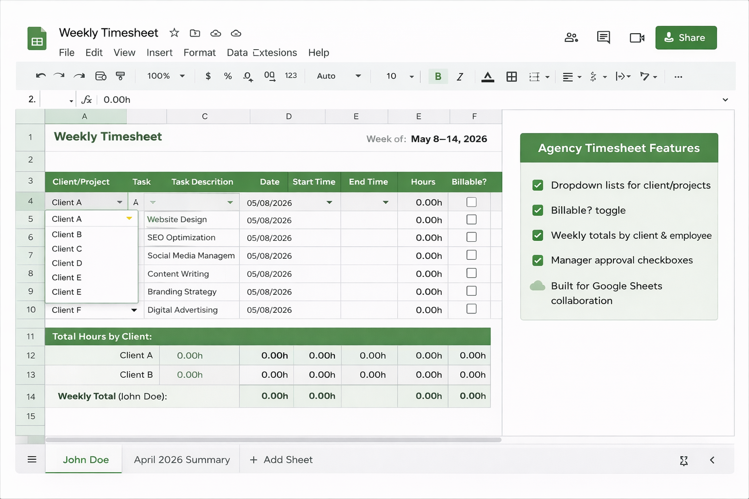 Google Sheets is the default for most agencies because it supports real-time collaboration and reduces version-control chaos. One shared timesheet can work well for small teams, while larger teams can use one sheet per person (or per client) and roll up totals into a weekly summary tab.