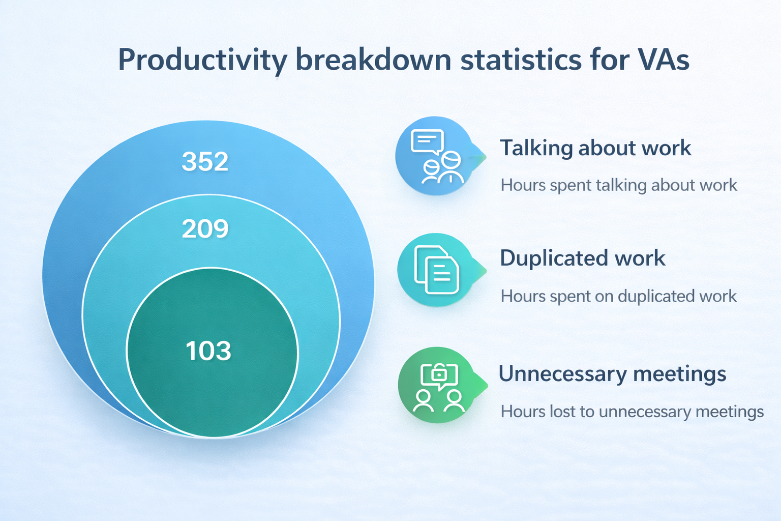 Productivity tools matter for virtual assistants because managing work manually takes more time than doing it. Research from Asana and Microsoft shows this clearly. A large part of the workday is lost to coordination, status updates, duplicated effort, and interruptions rather than execution.