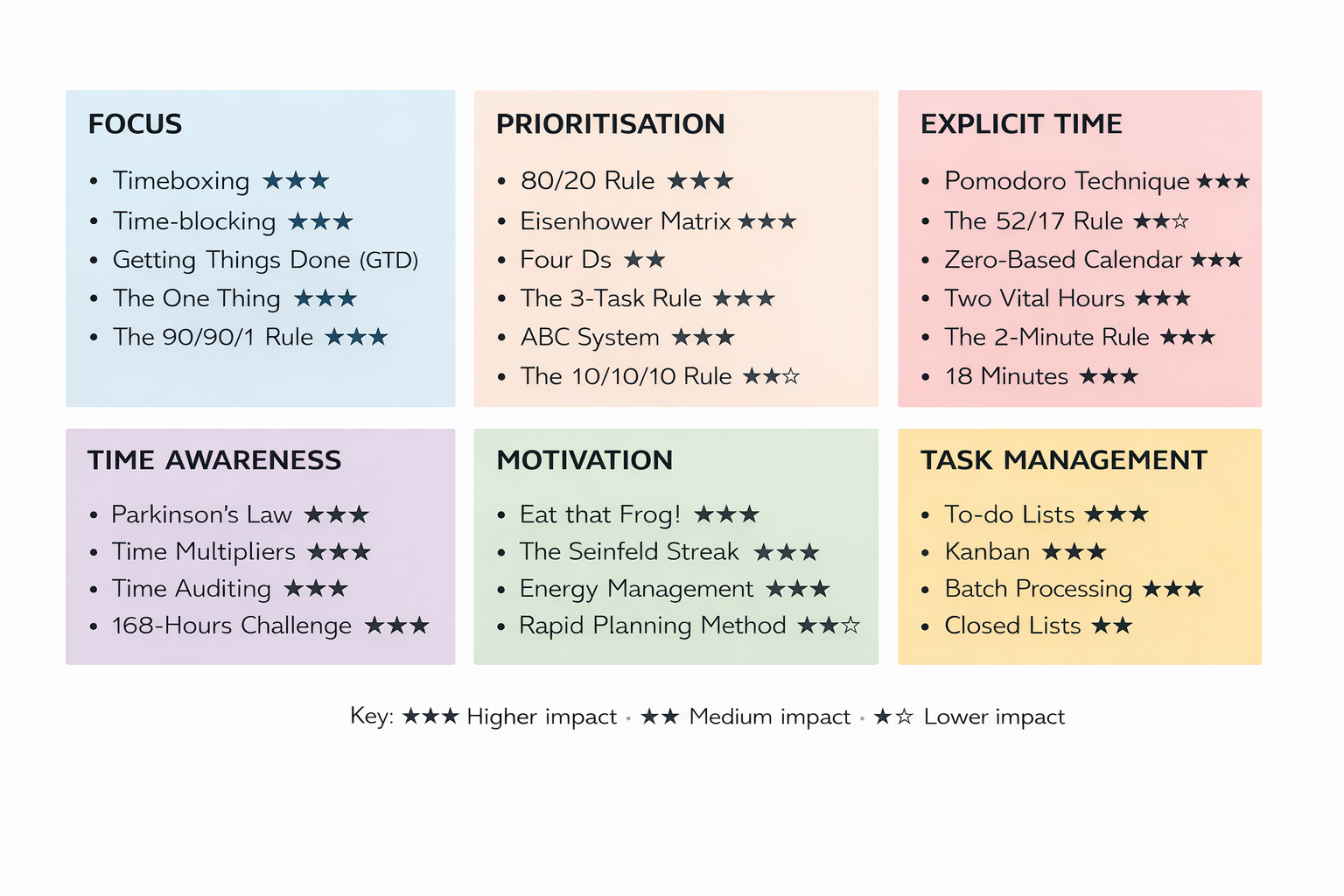 There are many time management techniques, but they are not all created equally. As the overview above shows, different methods address different productivity challenges—some improve focus, others help with prioritization, structure work time, increase time awareness, boost motivation, or simplify task management.