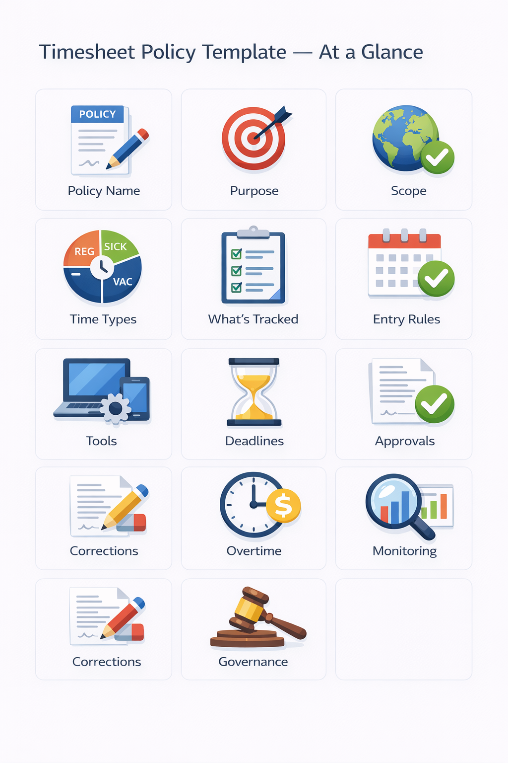 A timesheet policy is a documented set of rules that defines how work time is recorded, submitted, reviewed, and approved. It establishes expectations for accuracy, timeliness, and accountability: and specifies how late, missing, incorrect, or post-approval changes are handled.