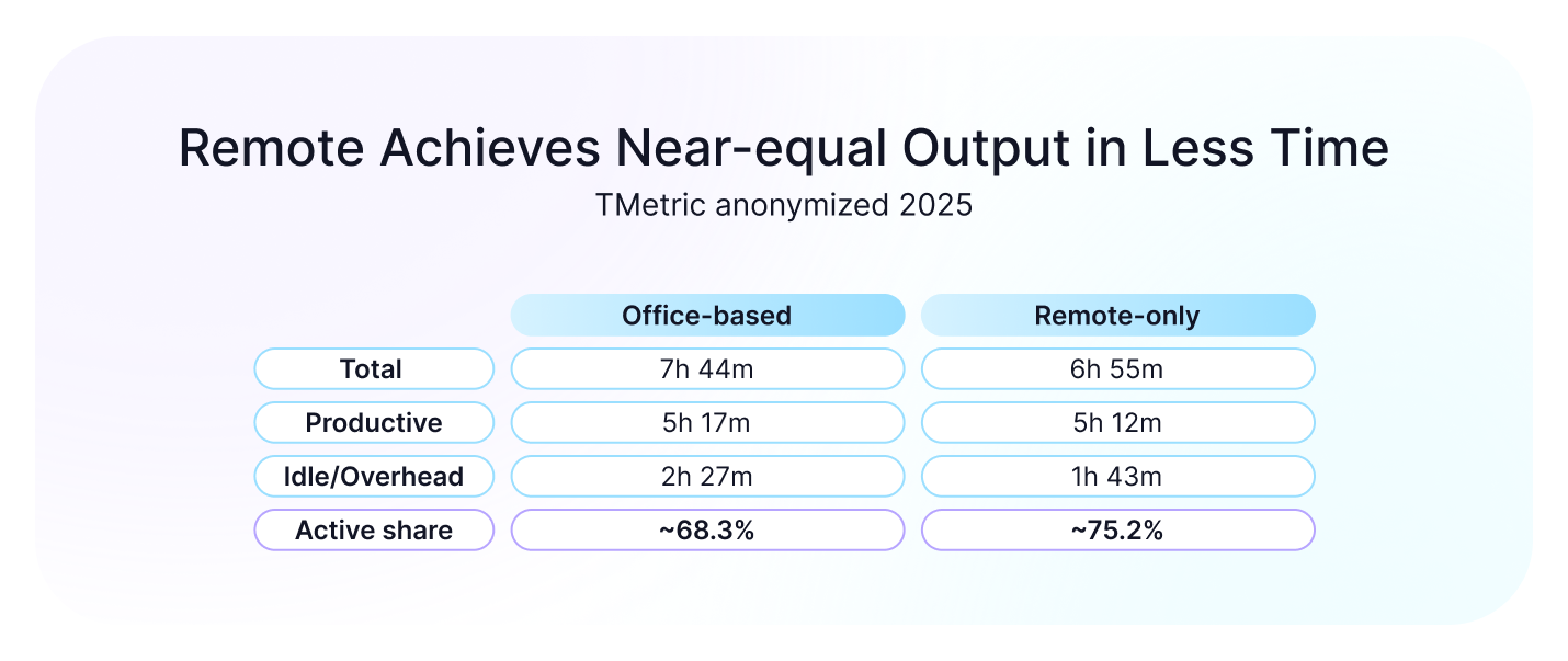 - Remote work delivers almost the same productive hours in less time. 6h 55m total → 5h 12m productive vs. office 7h 44m → 5h 17m.