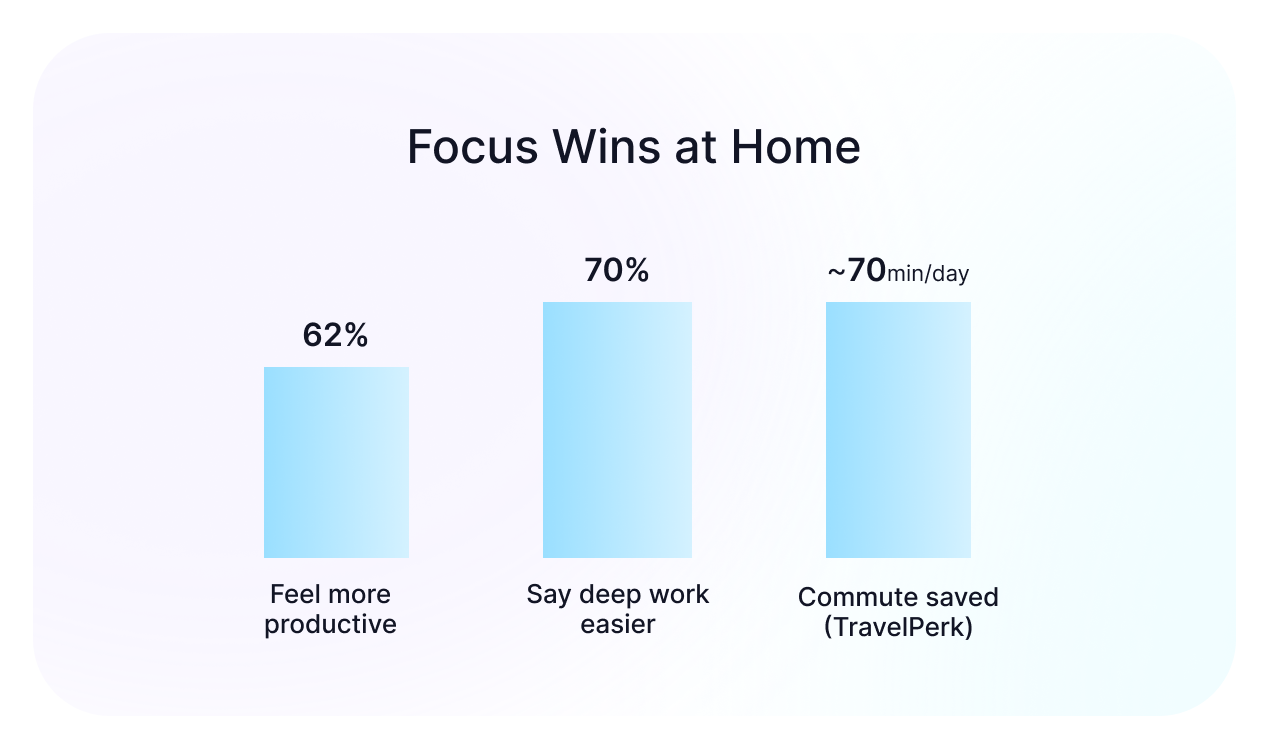 - Focus wins at home. ~62% feel more productive, ~70% say deep work is easier; ~70 min/day saved on commute often converts to real work.