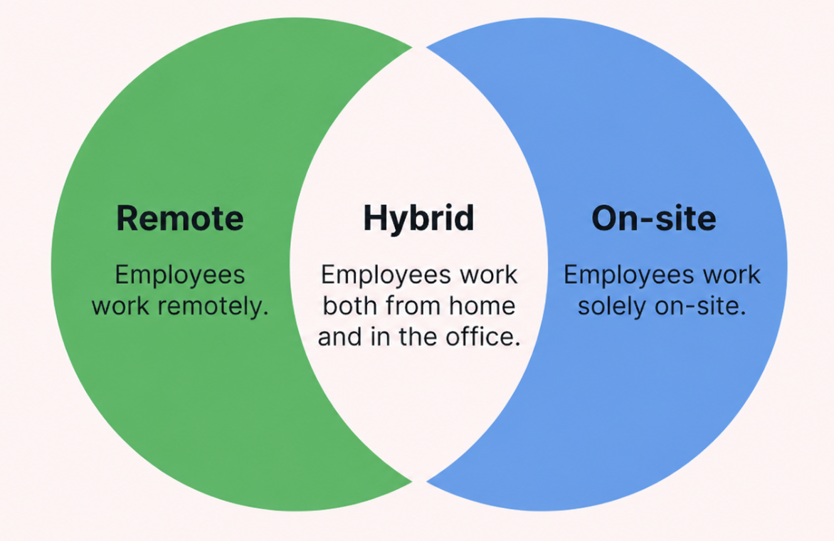 This model works well for teams that rely on daily stand-ups, client-facing roles that benefit from in-person visibility, and organizations making the transition from fully onsite to hybrid.