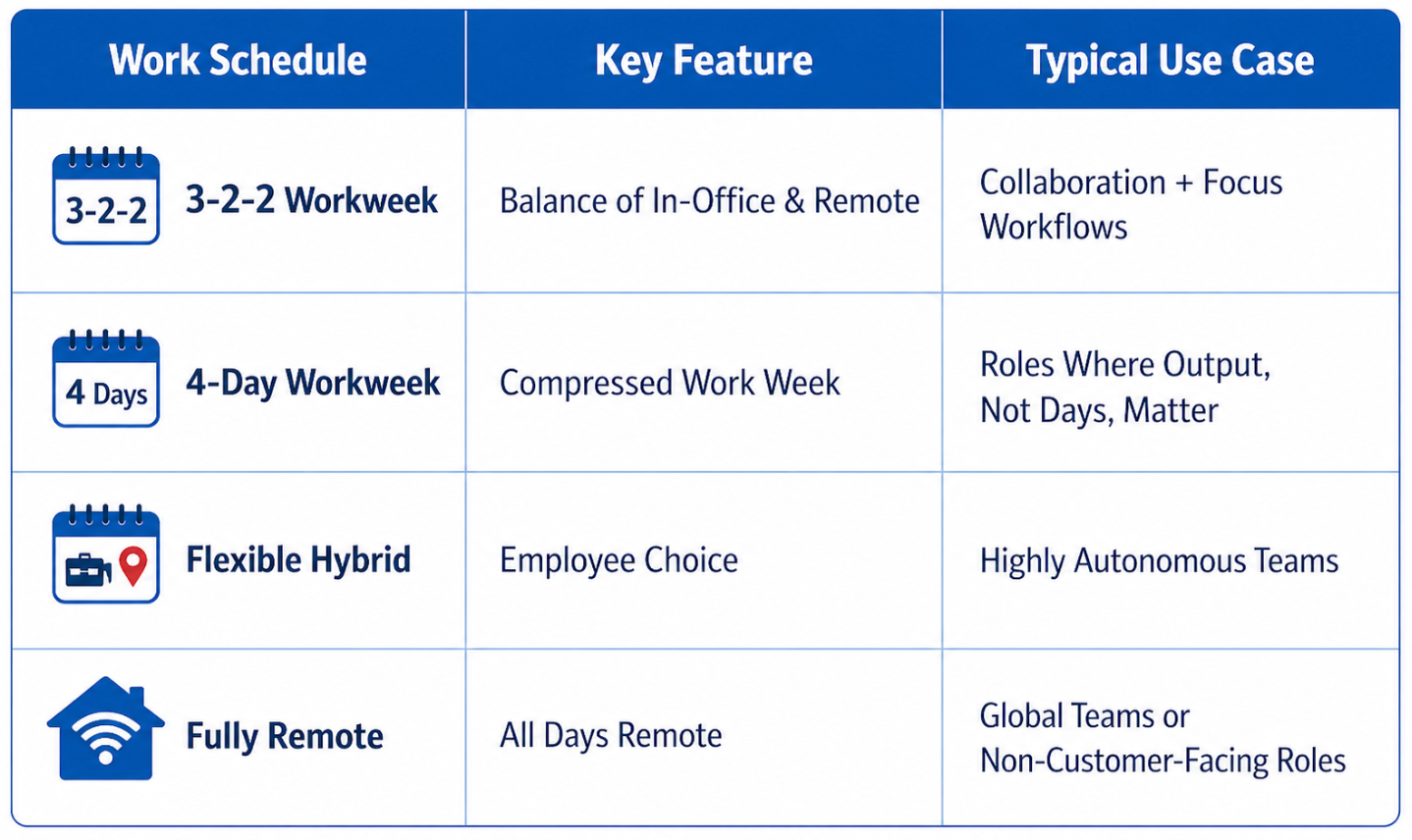 This model is particularly useful for organizations where roles vary significantly in terms of collaboration intensity. It aligns schedule structure with actual job requirements, rather than applying a blanket policy across everyone.
