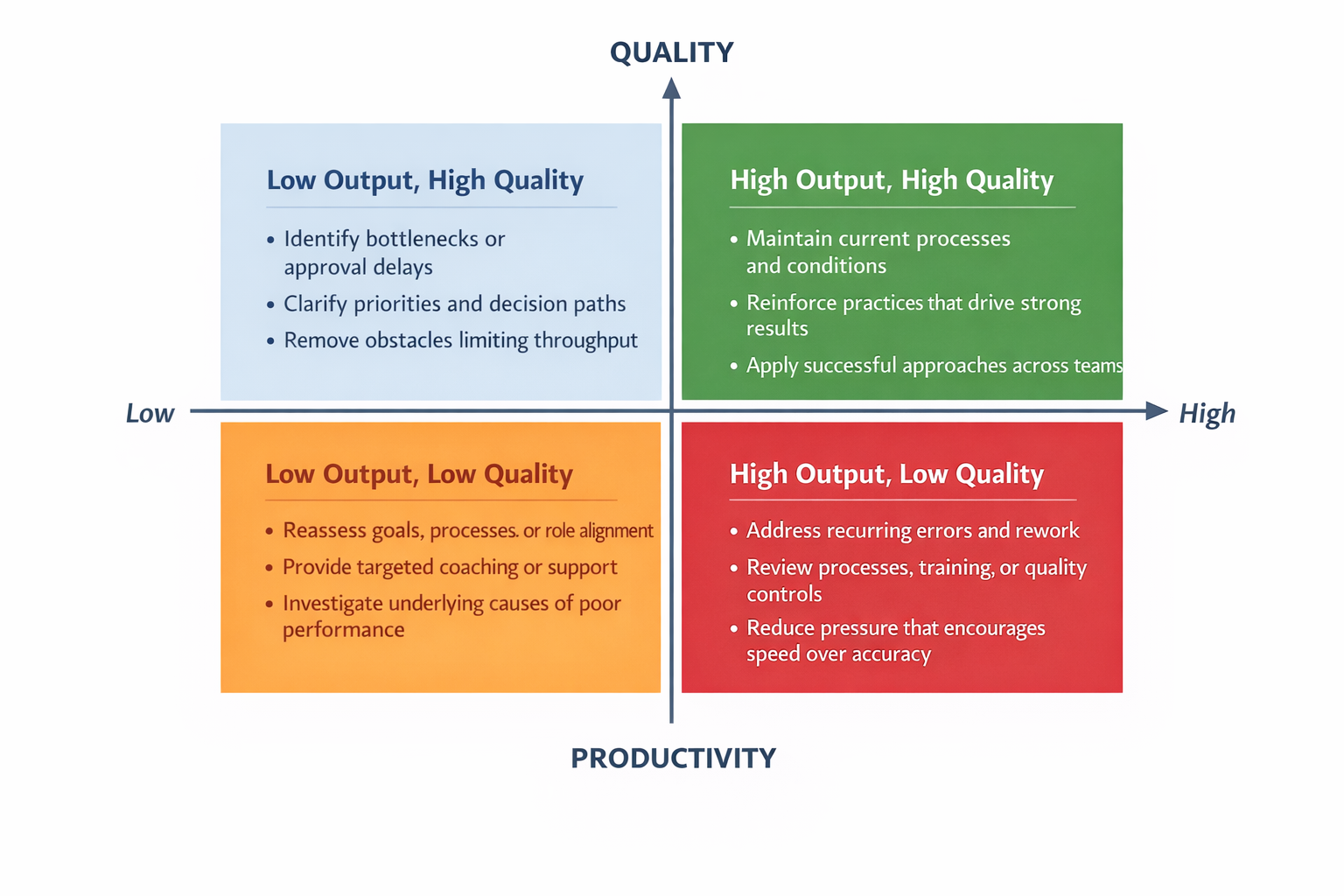 By evaluating output and quality together, the matrix prevents simplistic conclusions based on a single metric. Managers can diagnose issues accurately and respond in ways that improve performance rather than masking underlying problems.