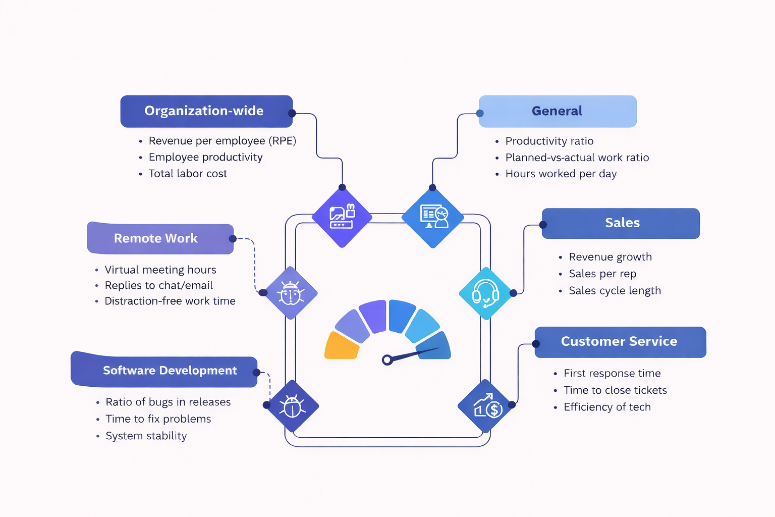 Certain productivity metrics are widely used because they apply across industries and roles. Together, they provide a practical starting point for organizations that want measurable insight into performance without building complex models.
