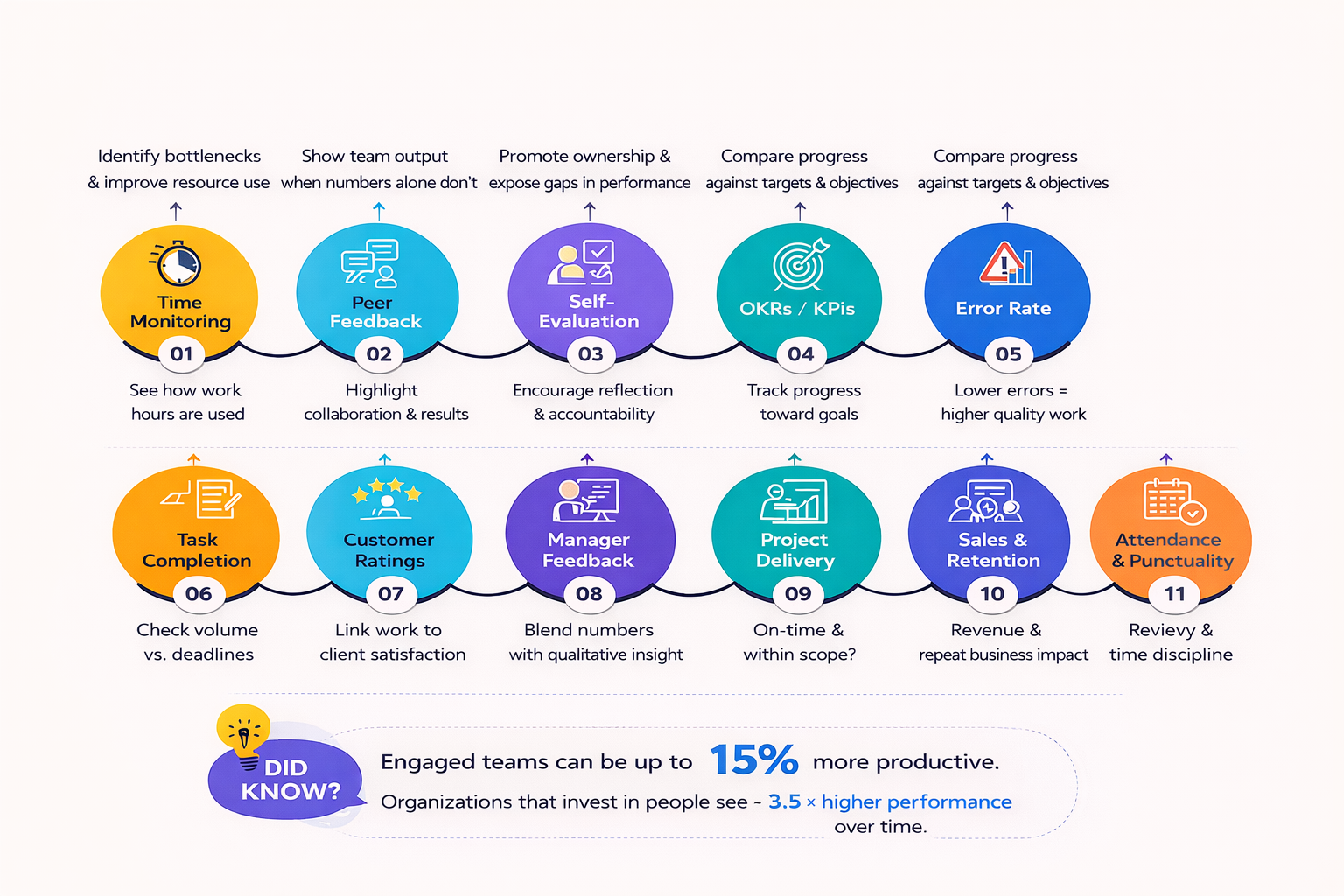 Employee productivity metrics are measurable indicators showing how effectively people convert time, effort, and resources into valuable output. They quantify performance instead of relying on impressions.