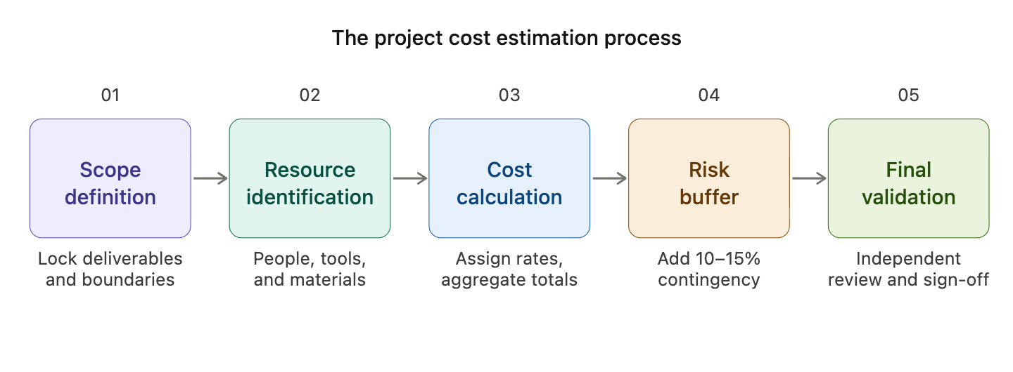 Accurate project cost estimation follows a structured, repeatable process, not a round of educated guesses. Estimating project costs without a defined methodology produces figures that crumble under scrutiny and become liabilities when conditions shift mid-delivery.